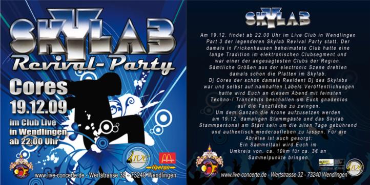 Sämtliche Größen aus der electronic Szene drehten damals schon die Platten im Skylab. Dj Cores der schon damals Resident Dj des Skylabs war und selbst auf namhaften Labels Veröffentlichungen hatte wird Euch an diesem Abend mit feinsten Techno-/ Trancehits beschallen um Euch gnadenlos auf die Tanzfläche zu zwingen.